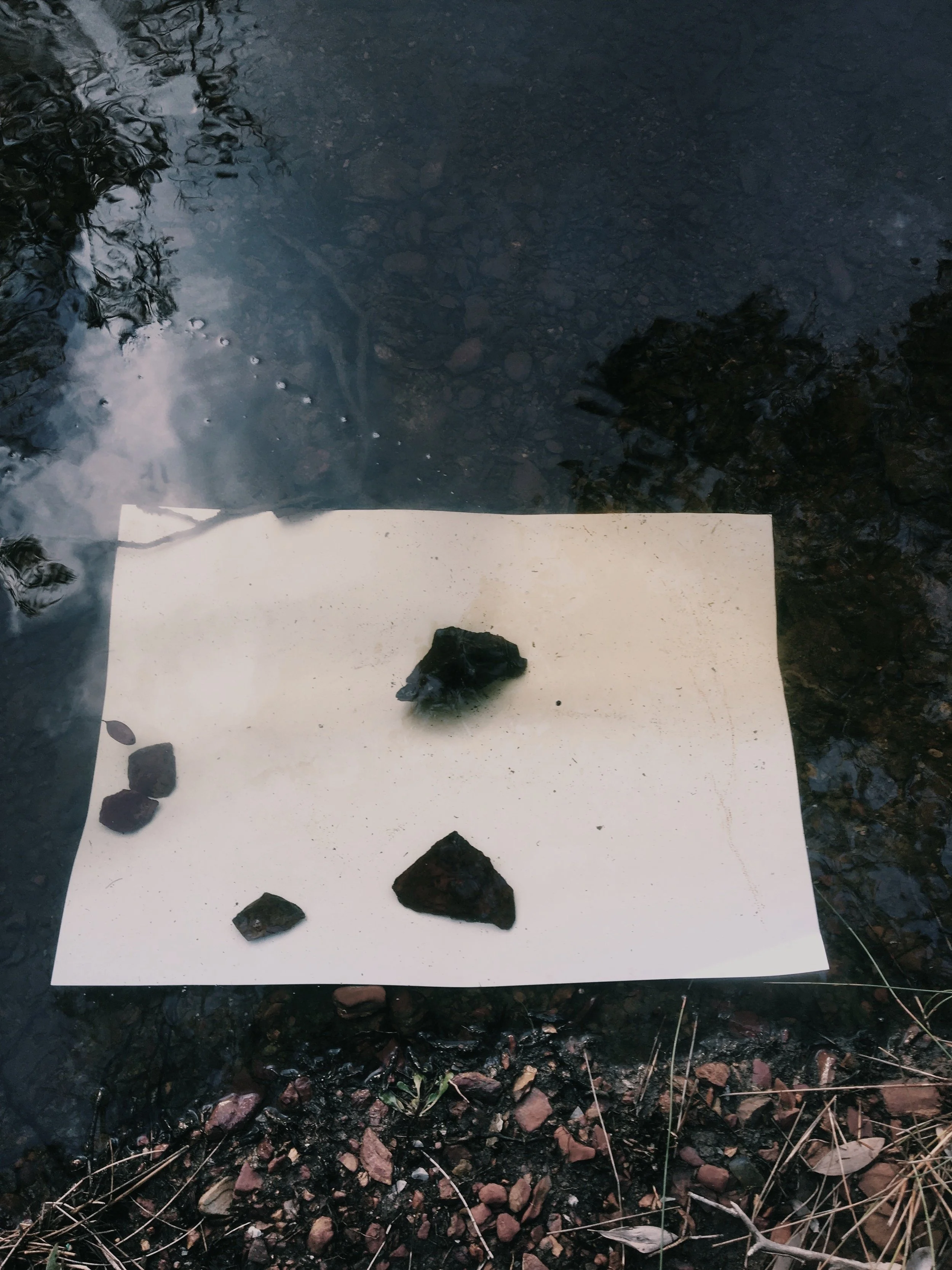 Once the paper is left in-situ, my control over the outcome is surrendered and chance becomes a key component in the art-making process. Decisions are made of course; where the paper is placed, how long it is left in the elements, whether to include it in a body of work (a legitimising experience for a soggy piece of paper with slugs on it) or whether to discard it as rubbish as a few well-intentioned passers-by have done for me. But how the charcoal pools around a fallen leaf after an especially heavy downpour in Three Days Rain Under Bamboo - that singular mark was beyond my control. An uneasy yet liberating exercise for an artist.